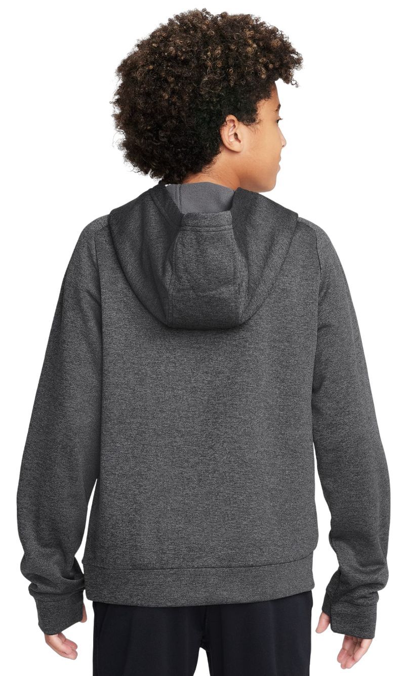 Пуловер с капюшоном Nike Multi+ Therma-FIT для мальчиков — черный/антрацитовый/белый Толстовка из мягкого и теплого материала. Имеет передний карман с доступом с обеих сторон. Отверстия для пальцев на концах рукавов. Толстовка изготовлена по технологии THERMA-FIT.
