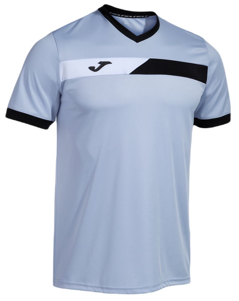 Мужская футболка Joma Court с коротким рукавом — небесно-голубой/темно-синий/белый Классическая простая футболка обычного кроя с V-образным вырезом. Изготовлена из очень легкой и воздушной ткани. Материал гибкий и слегка эластичный, поэтому идеально садится по фигуре. Гладкий полиэстеровый материал гарантирует высокий комфорт во время занятий и эффективное впитывание влаги. На правой груди виден логотип производителя.