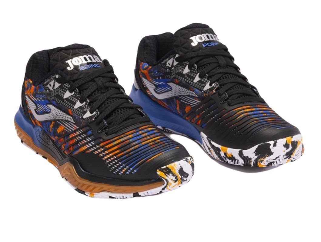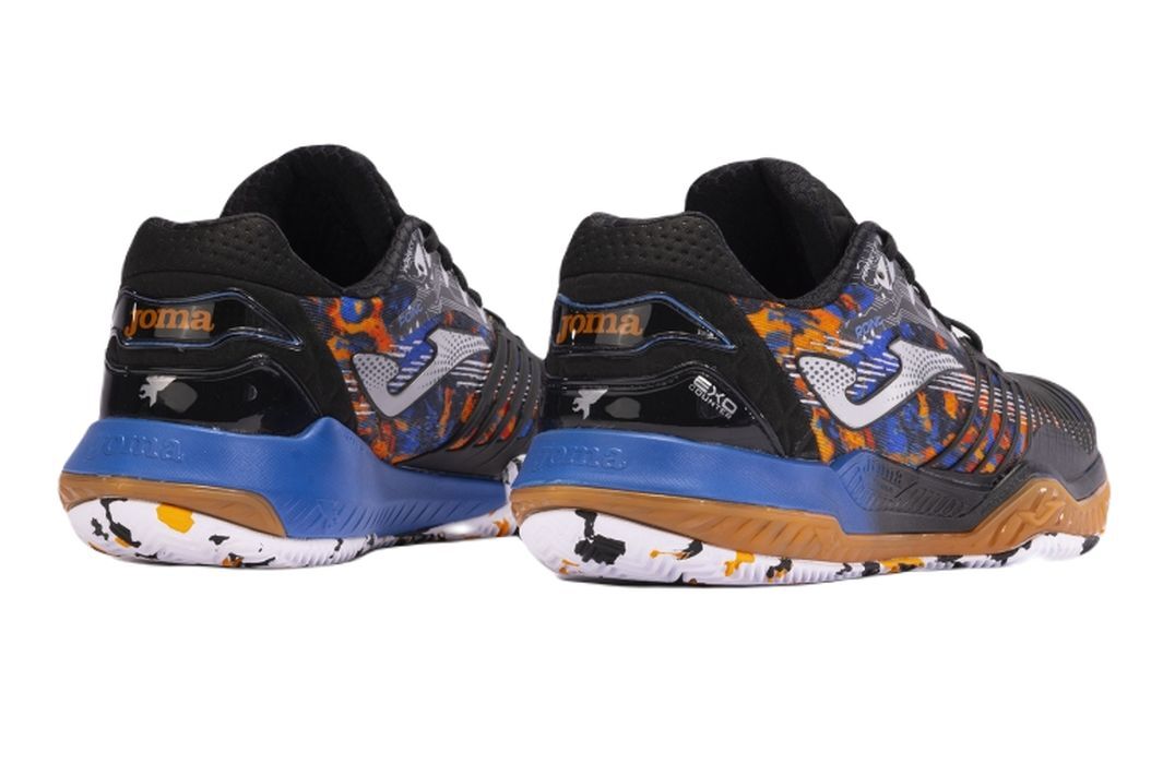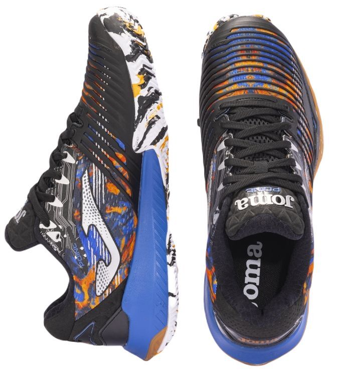 Мужские теннисные кроссовки Joma T.Point Men 2401 Clay - черный/оранжевый Модель предназначена для требовательных игроков, которым нужна обувь с очень хорошей амортизацией и стабилизацией. Прочный верх со специально расположенными зонами вентиляции элегантного современного вида сочетает в себе достаточную поддержку стопы и хорошую воздухопроницаемость. Язычок частично выполнен из сетчатой панели. Усиление ExoCounter обеспечит хорошую защиту пятки. Межподошва из пеноматериала и технологии Stabilis отвечает за устойчивость и сцепление. Прекрасно поддерживает поддержание правильного баланса. Большой упор на защиту от травм благодаря усилениям в критических местах. Благодаря профилю протектора обувь предназначена для игры на грунтовых кортах. Используемые технологии: PerfectFit, Protection, Sportech, RubberTech, Flexo.