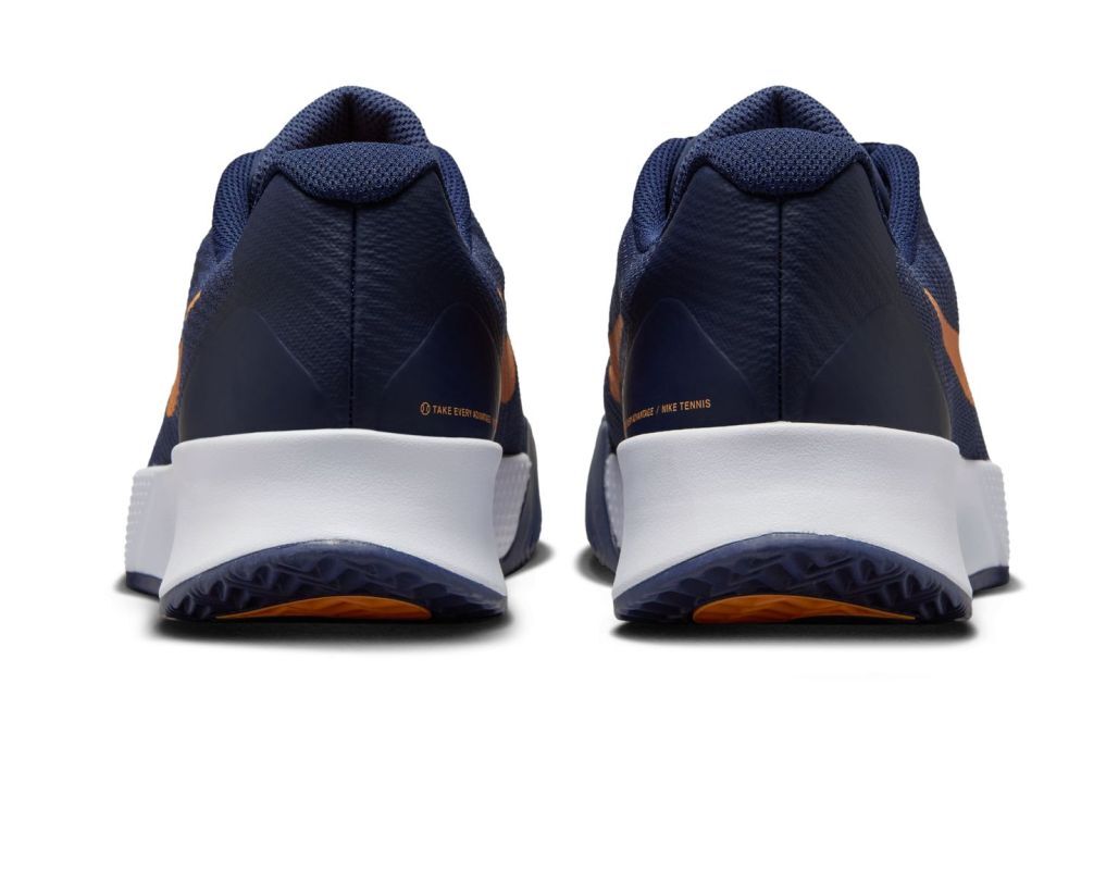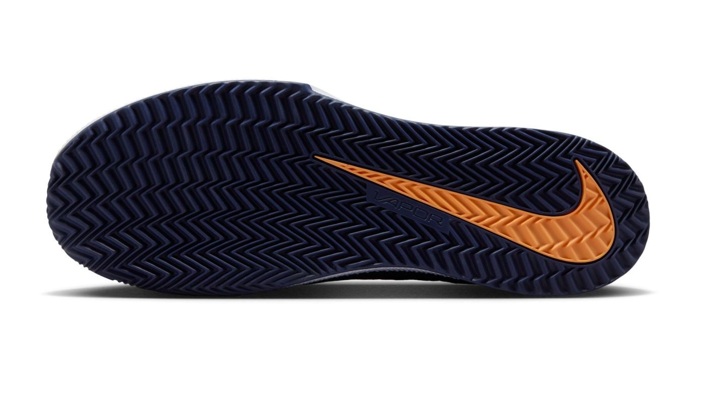 Мужские теннисные кроссовки Nike Vapor Lite 3 Clay - Thunder Blue/Marakesh-Obsidian Еще одно обновление модели Vapor Lite обеспечивает еще большую легкость и больший комфорт при ношении. Гибкий верх из сетчатого материала и язычок, частично выполненный из сетчатой панели, повышают вентиляцию и комфорт использования. Носок и пятка, окруженные резиновыми усилениями, обеспечивают большую прочность. Удаление резины из участков, менее подверженных износу, и использование более легкой резиновой смеси в подошве позволило снизить вес до минимума, что обеспечивает более быстрое перемещение по корту. Внутри кроссовок использован носок с интегрированной структурой, который идеально обхватывает стопу, гарантируя ее дополнительную поддержку и устойчивость. Мягкий воротник с U-образной горловиной облегчает надевание и повышает комфорт при ношении. Промежуточная подошва выполнена из отличной амортизирующей пены. Специально разработанный протектор подошвы с учетом карт давления и анализа участков, где скапливается больше всего глины, обеспечивает отличное сцепление на грунтовых кортах и снижает налипание осадка.