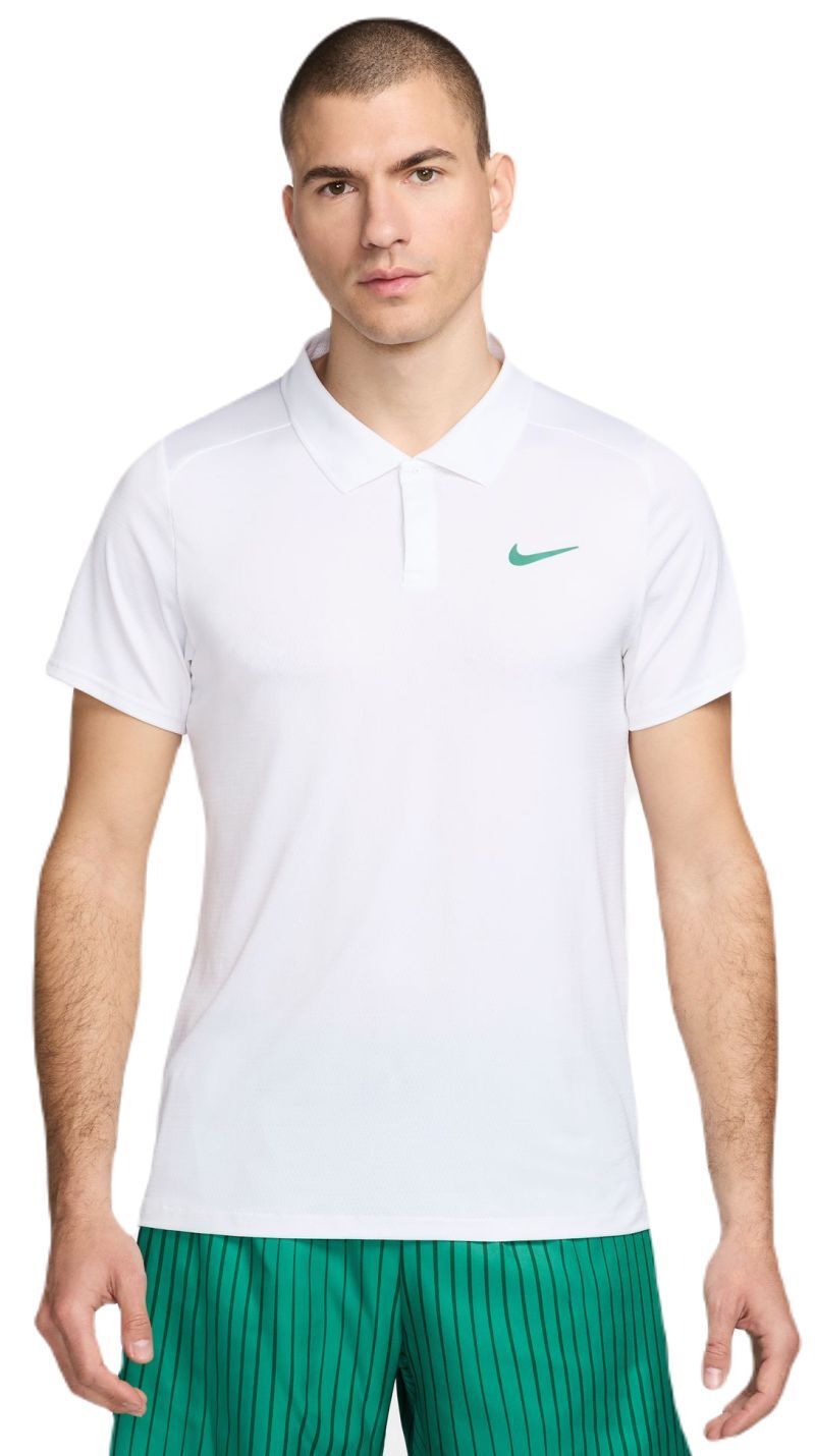 Мужская футболка-поло Nike Court Dri-Fit Advantage Polo - белый/малахитовый Легкая и дышащая рубашка-поло стандартного кроя. Имеет ребристый воротник, застегивающийся на две пуговицы на шее. Гибкий материал гарантирует комфорт и свободу во время занятий. Удлиненная спинка повышает защиту, а боковые разрезы увеличивают диапазон движений. Микроперфорация по всей поверхности обеспечивает хорошую вентиляцию. Поло, изготовленное по технологии DRI-FIT.