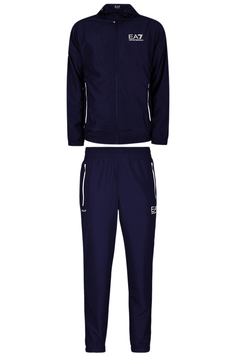 Мужской спортивный костюм EA7 Man Woven Tracksuit - темно-синий Тонкая, легкая толстовка с капюшоном и завязками для лучшей посадки. Толстовка застегивается на молнию по всей длине. Два боковых кармана на молнии. Толстовка дополнена манжетами для лучшей посадки. Широкий эластичный пояс со шнурками обеспечивает отличную посадку и комфорт при использовании. Два кармана на молнии. Для удобства в ногах имеются отверстия. Спортивный костюм изготовлен из дышащей ткани с использованием технологии VENTUS7.