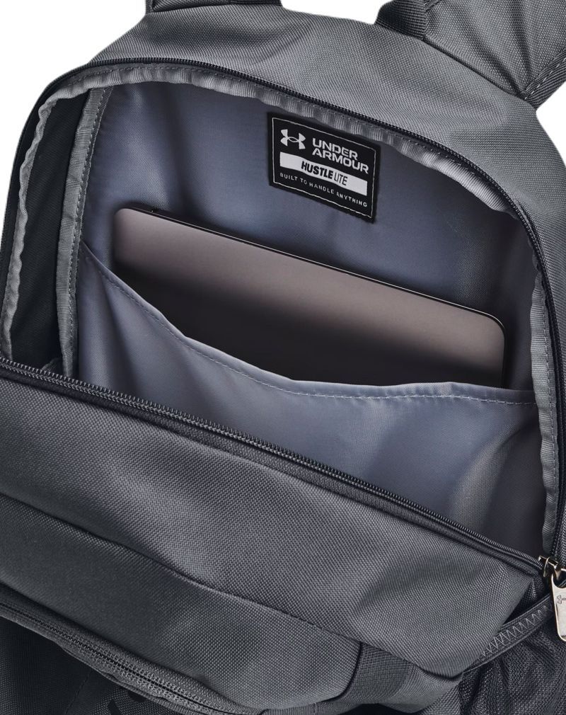 Рюкзак Under Armour Hustle Lite - темно-серый/черный Отделка UA Storm обеспечивает высокую устойчивость к воде и грязи. Мягкая задняя панель с эргономичными лямками обеспечивает удобную посадку и комфорт при ношении. В основном отделении имеется внутренний органайзер на мягкой подкладке для переноски ноутбука до 15". Передний карман на молнии для хранения ценных вещей. Боковой карман для бутылки с водой.