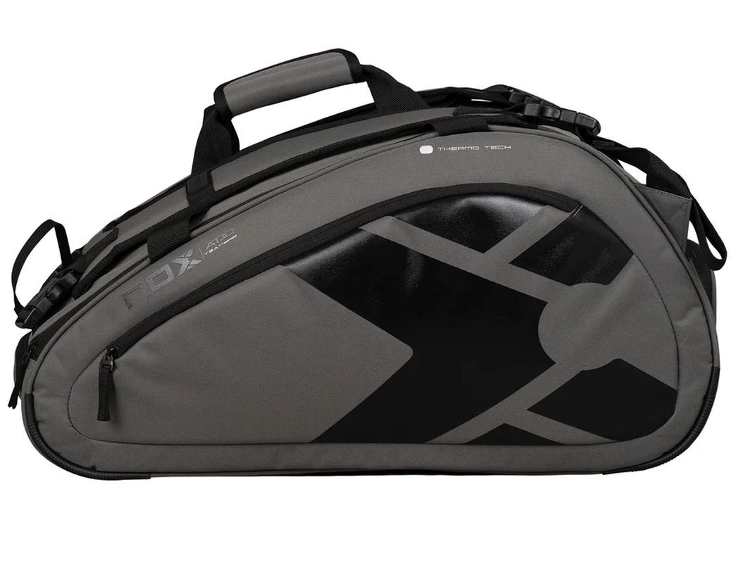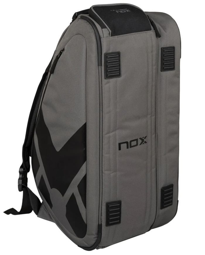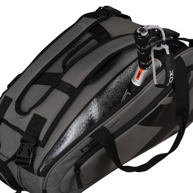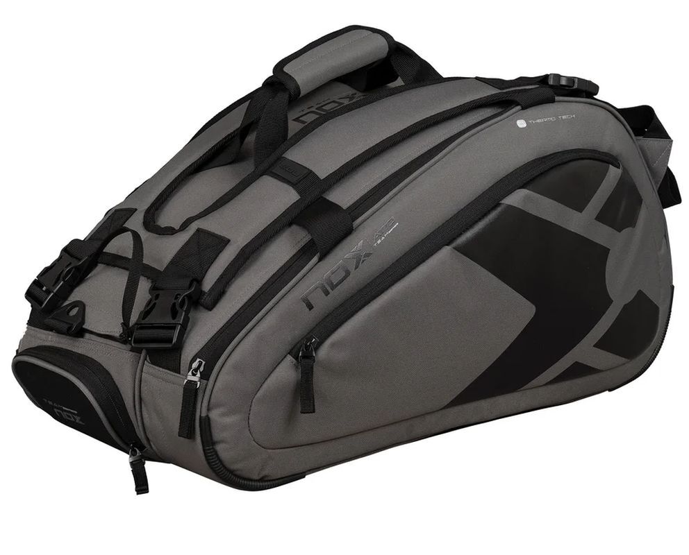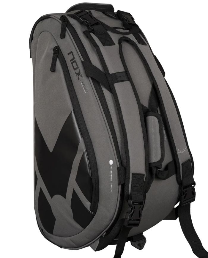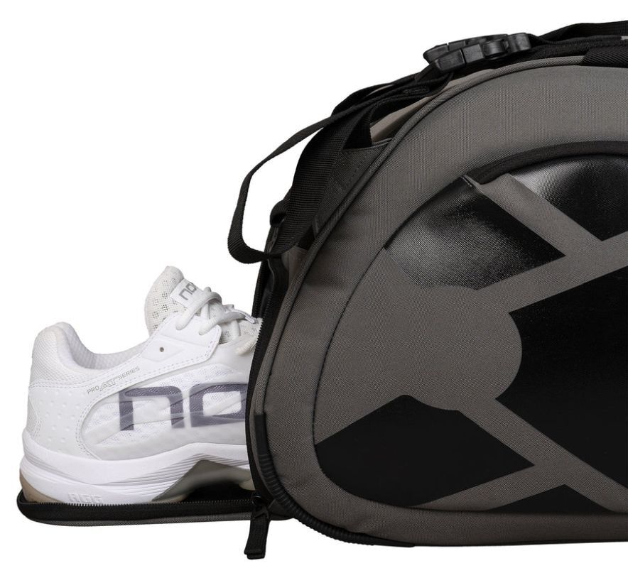 Сумка для весла NOX AT10 Team - серый/черный Функциональная сумка с двумя отделениями емкостью 42 литра. Перегородка с термоизоляционной защитой позволит носить с собой 2 ракетки для падела. Основное, очень просторное отделение застегивается на двойную молнию с дополнительной липучкой вверху и позволяет легко разместить все необходимое снаряжение. Дополнительный элемент жесткости позволяет разделить его на два отсека. Три внешних кармана для аксессуаров закрываются на молнии – два больших по бокам и один поменьше внизу. Отдельный вентилируемый отсек для обуви. Сумка имеет две лямки для ношения как рюкзака и ручку для ношения в руке. Изготовлен из высококачественных материалов с усиленными боковинами.