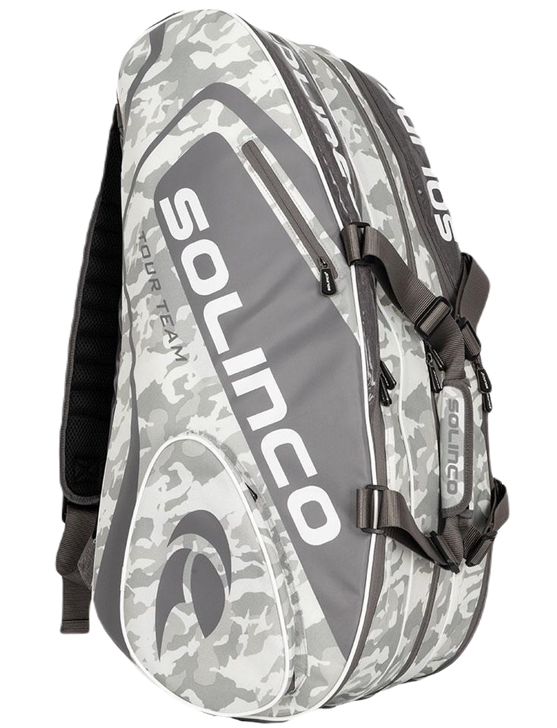 Теннисная сумка Solinco Racquet Bag 15 - белый камуфляж Трехкамерная термосумка с двумя термокамерами, вмещающая до 15 ракеток. Имеет четыре дополнительных отделения для аксессуаров. Оснащен двумя разделенными ручками для переноски сумки в руке. Два плечевых ремня с сетчатой вставкой позволяют носить сумку как рюкзак. Ручка для вертикального положения сумки. Отделка молний изготовлена из очень прочного материала. Сумка изготовлена из легко чистящегося материала. Чрезвычайно вместительный и практичный, идеально подходит для повседневного использования на корте.