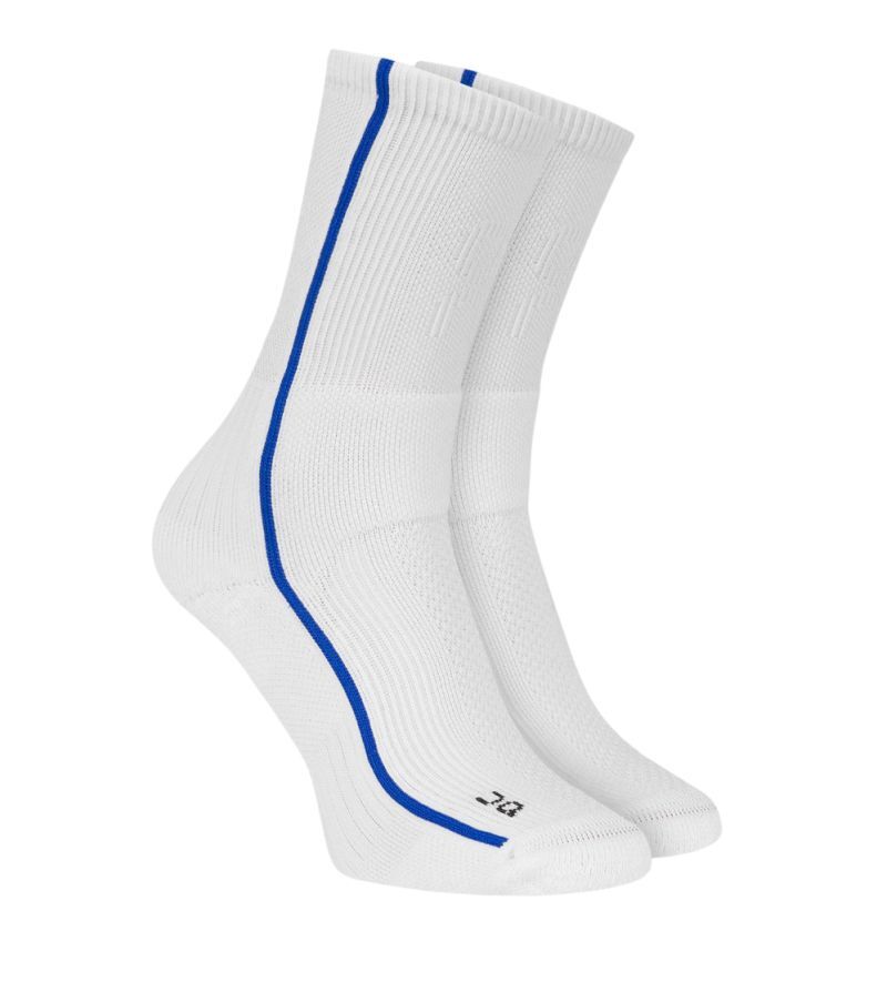 Высокие носки On Court - белые/индиго Специально разработаны для обеспечения максимальной защиты и комфорта во время занятий спортом. Анатомически подогнаны под правую и левую ногу, имеют соответствующую маркировку. Контурный материал пятки и усиления в области носка гарантируют амортизацию и достаточную прочность. Зоны вентиляции предотвращают чрезмерное потоотделение. Зональная компрессия обеспечивает поддержку свода стопы и лодыжки, а бесшовная конструкция снижает риск натирания и появления мозолей. В упаковке 1 пара носков.