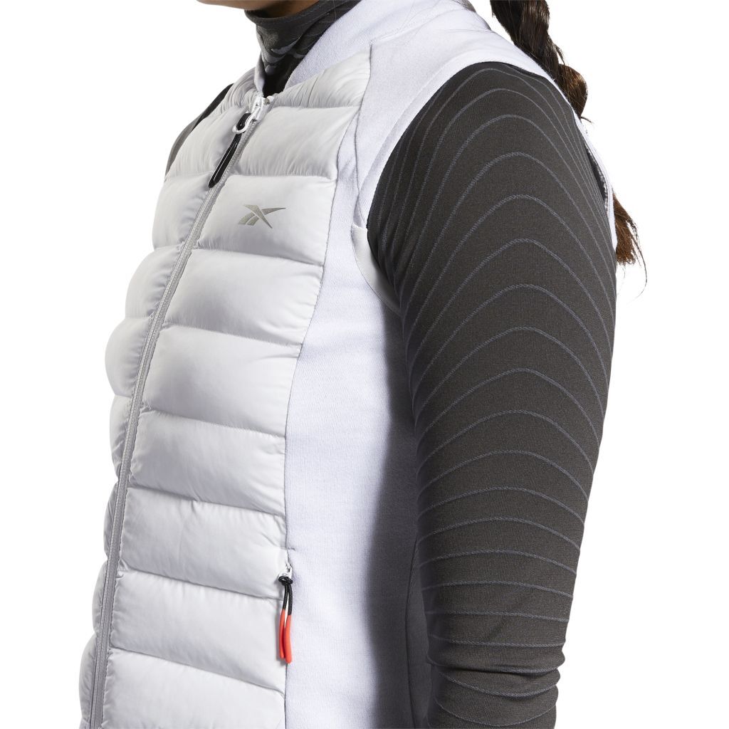 Женский теннисный жилет Reebok DMX Training Hybrid W - холодный серый/светоотражающий серебристый Застегивается на молнию во всю длину. Два боковых кармана закрываются на молнии. Приятный на ощупь и удобный материал.