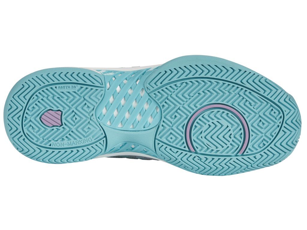 Женские теннисные туфли K-Swiss Hypercourt Express 2 - ярко-белый/голубой/прозрачный сиреневый Модель легкая и быстрая, но при этом обеспечивает всесторонний комфорт. Верх был сконструирован так, чтобы быть еще более гибким и поддерживающим, что делает эту обувь отличной для максимальной нагрузки на ноги. Это будет плавный переход от предыдущей версии, поскольку они будут намного удобнее и в то же время позволят чувствовать себя стабильно на площадке. Подошва сочетает в себе сцепление, долговечность и обеспечивает исключительную устойчивость. Создан для амбициозных и агрессивных игроков. Используемые технологии: DurawrapFlex, Surge 7.0 для максимального скручивания корпуса и Dragguard 7.0 для увеличения долговечности подошвы. Кроме того, межподошва CMEVA. Технология межподошвы Surgelite обеспечивает легкую амортизацию и поддержку стопы. Подошва сочетает в себе сцепление и долговечность и обеспечивает надежную работу на любой поверхности корта.